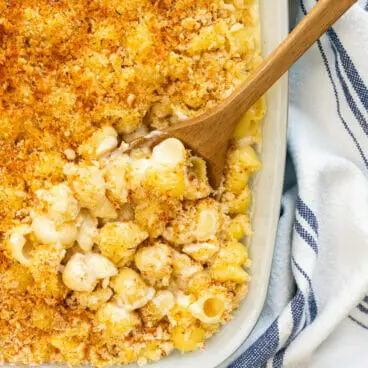 - Coloque o macarrão em uma camada uniforme em uma travessa 9 x 13 e despeje o molho de queijo por cima. Cubra com o pão ralado e grelhe por 2 a 4 minutos até dourar levemente, virando a frigideira para uniformizar o escurecimento conforme necessário. Sirva imediatamente.