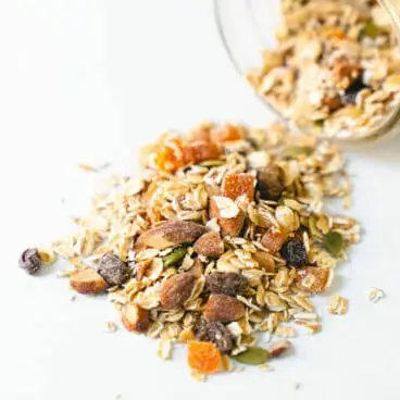 Esta receita instantânea de aveia leva cerca de 5 minutos para misturar a quantidade a granel e, em seguida, cerca de 2 minutos para prepará-la no micro-ondas pela manhã. Você consegue algo mais simples ou mais rápido do que isso? Não acredito que Alex e eu nunca fizemos isso antes! Para fazer a mistura instantânea de aveia, você precisará de aveia em flocos à moda antiga e de frutas secas e nozes de sua escolha. Para nossa receita de aveia instantânea, usamos damascos secos, passas, pepitas (sementes de abóbora) e algumas amêndoas torradas picadas. Misture um pouco de canela e pronto! Você pode armazenar a mistura instantânea de aveia em uma grande jarra de vidro coberta em sua bancada.