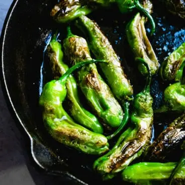 Pimentas Shishito ficam melhores quando estão com bolhas! Cozinhe esses pimentões suaves em uma frigideira quente e polvilhe com sal. Aposto que você não consegue comer apenas um!