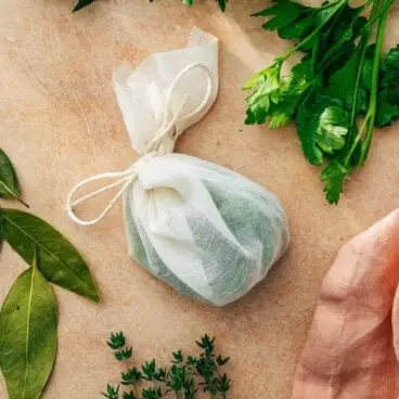 - Amarre as ervas em uma gaze. Adicione as ervas a um quadrado de gaze (ou outro pano limpo) e amarre a ponta com um barbante de cozinha.
