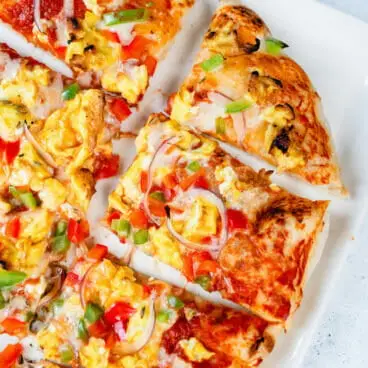 Claro, nenhuma pizza de café da manhã está completa sem ovos mexidos! Usamos nosso melhores ovos mexidos método e depois dividimos em algumas migalhas que espalhamos na pizza. Cubra isso com um punhado de pimentões verdes e vermelhos picados e cebolas vermelhas em fatias finas, e você estará no negócio. É sem dúvida a melhor pizza de café da manhã que já fizemos.