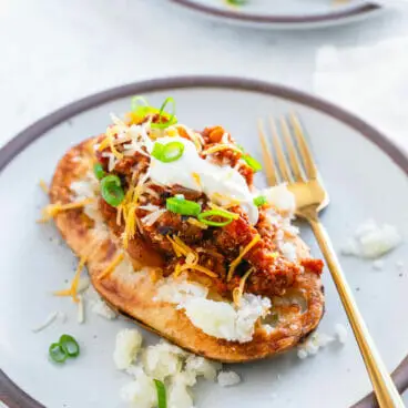 Estas batatas assadas com chili são perfeitas para uma barra de batata assada! Prepare as batatas e o pimentão e, em seguida, muitas coberturas para seus convidados escolherem. Há tantas coisas divertidas para adicionar! Aqui estão alguns dos nossos favoritos coberturas de batata assada :