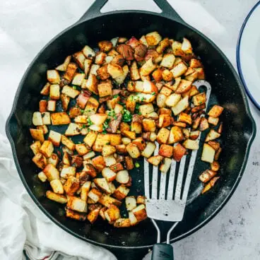 Quando se trata de receitas de café da manhã , estamos solidamente no campo dos saborosos. Então, nosso acompanhamento favorito para o café da manhã ou brunch? Conheça isso Batatas fritas caseiras receita! Essas batatas ficam crocantes, douradas, macias por dentro e perfeitamente temperadas com alho, cebola e sal. Este favorito estilo lanchonete é perfeito com um ovo estrelado de manhã, mas também funciona como acompanhamento de jantar com hambúrgueres ou salmão. Não conseguíamos parar de dar mordidas na frigideira!
