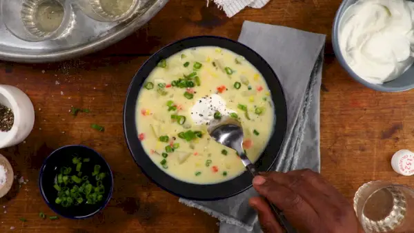 Variação de milho congelado: Se quiser usar milho congelado, bata duas xícaras com o leite conforme indicado acima e adicione as duas xícaras restantes à sopa junto com o purê. Como o milho já está cozido, pode endurecer se entrar mais cedo. Você também pode adicionar uma pitada de açúcar, se quiser.