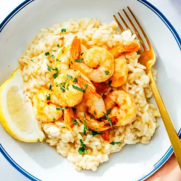 Por que amamos esta receita: O risoto de camarão é ótimo para impressionar os convidados como prato principal, mas é simples o suficiente para funcionar também como refeição durante a semana. Nossa família inteira engole quando fazemos isso.