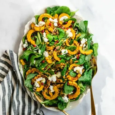 Salada de abóbora Delicata é um acompanhamento perfeito para o outono ou inverno! Este apresenta abóbora torrada caramelizada, sementes de romã e um vinagrete picante.