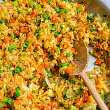 O arroz frito é um prato de arroz cozido, ovos, frutos do mar ou carne e vegetais, popular em muitas cozinhas asiáticas: chinesa, japonesa, coreana, tailandesa, cambojana, indonésia e muito mais. É servido em restaurantes e feito por cozinheiros caseiros: fazendo milhões de variações com base nos ingredientes disponíveis e no chef! O ditado mais básico para esta receita clássica é: use arroz do dia anterior . Por que usar arroz do dia anterior para arroz frito?