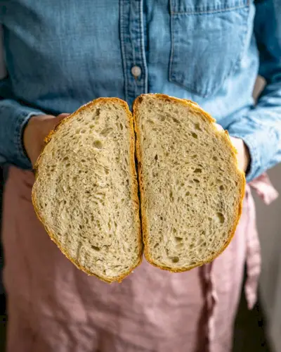 - Reduza para 400°F e leve ao forno por 25 a 27 minutos: Após os 16 minutos, reduza a temperatura do forno para 400°F. Retire o forno holandês, retire o pão com cuidado e coloque-o diretamente na grelha do forno. (Ou para o pedra de pizza método, abra a porta do forno algumas vezes para ventilar o excesso de ar úmido.) Asse por mais 25 a 27 minutos, até ficar oco quando batido ou a temperatura interna estiver entre 205 e 209 Fahrenheit. Retire o pão do forno e deixe esfriar sobre uma gradinha por pelo menos 45 minutos. Após esfriar, o pão está pronto para comer. Guarde o pão embrulhado em pano ou em saco plástico na bancada por até 2 dias, ou congele (fatiado) embrulhado em papel alumínio em um saco plástico por vários meses.