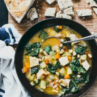 Ribollita é um ensopado de vegetais italiano tradicionalmente engrossado com pão como forma de aproveitar crostas velhas e estragadas. É fervido suavemente para que os sabores se misturem lindamente. Os cubos de pão crocantes parecem quase bolinhos quando embebidos no saboroso caldo.