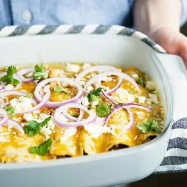Com a guarnição por cima, essas enchiladas verdes ficam maravilhoso . Os lindos círculos de cebola vermelha roxa contrastam com o brilhante queijo Monterrey jack, o coentro fresco e o queso fresco esfarelado. Deixe-nos saber se você experimentar essas enchiladas: elas são uma das nossas receitas mexicanas vegetarianas favoritas de todos os tempos!