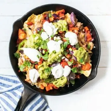 Grelhar os vegetais para as coberturas de nacho aumenta o sabor defumado e grelhado para que esteja presente em cada mordida! Se você não tiver uma frigideira de ferro fundido, ela não será necessária para esta receita. Você pode usar qualquer assadeira para grelhar para a receita, incluindo uma assadeira de alumínio.