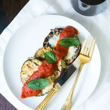 Esta berinjela grelhada com parmesão é uma maneira bastante fácil de preparar beringela ! Aqui a berinjela fatiada é mergulhada em clara de ovo e depois passada na farinha de rosca e no queijo parmesão. Em seguida, borrife as fatias com azeite para que fiquem juntas na grelha. Em seguida, grelhe a berinjela por cerca de 5 minutos de cada lado, derretendo um pouco de queijo mussarela por cima depois de virar. É isso! Em seguida, cubra com marinara quente e coma. É tão, tão saboroso e tão bom. É uma versão desconstruída de berinjela com parmesão que infunde um sabor defumado na berinjela.