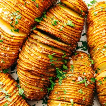 Esta receita de batatas Hasselback faz batatas assadas com um leque de fatias finas e crocantes. É um acompanhamento para impressionar!