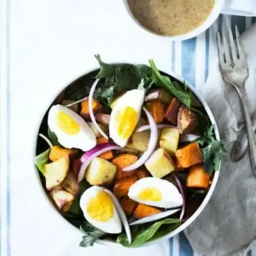 Algumas receitas em nosso arquivo são antigas favoritas, algumas fazemos com frequência e outras desapareceram na memória. Me deparei com esse outro dia e sabia que precisávamos refazê-lo. Esta salada de batata saudável é um tipo diferente de salada de batata: batatas servidas com verduras em vez de maionese. Pode ser uma salada principal ou lateral com batata vermelha assada, batata doce, ovos cozidos e verduras com nosso vinagrete de mostarda e mel favorito. Continue lendo para ver a receita saudável de salada de batata!