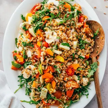 Esta receita de salada farro mistura vegetais frescos e um molho picante com este saudável grão integral! É um acompanhamento satisfatório ou uma salada de almoço.