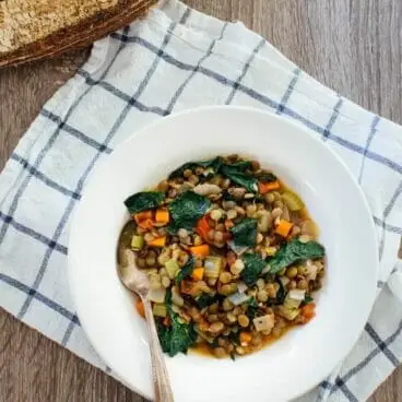 Esta receita de ensopado vegano apresenta lentilhas germinadas, couve Lacinato e vegetais coloridos que formam um ensopado farto e saboroso.