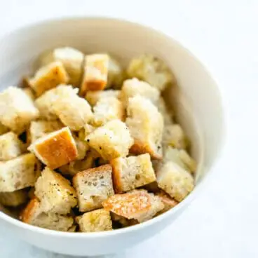 Ou a melhor maneira de incrementar suas receitas de saladas? Tentar Croutons Caseiros ! Esta receita de croutons é a maneira perfeita de aproveitar um pão que está começando a estragar ou de adicionar um toque elegante a um salada . Corte pedaços de pão, adicione um pouco de azeite e temperos e leve ao forno até ficarem crocantes! Não há nada melhor do que o crocante e crocante de alho de um crouton recém saído do forno. Esta é uma receita que usamos com frequência: aqui está o que você precisa saber!