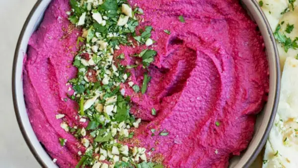 Este chocante homus de beterraba rosa é uma receita colorida de lanche saudável! Sirva com palitos de vegetais e pão pita para mergulhar.