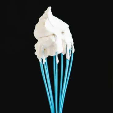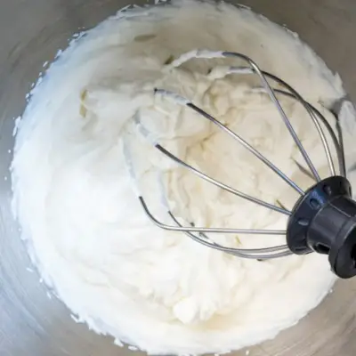 - Com um batedor grande, bata o creme movendo-o rapidamente para frente e para trás (tente bater em linha em vez de movimentos circulares). Chicote até a espessura desejada ser alcançada. Você pode usar um creme mais solto para uma garoa mais forte ou um chantilly mais duro para a textura tradicional do estilo Cool Whip. Dica: Você pode colocar a tigela na pia para bater o creme de forma que fique um pouco mais baixa que a mesa, o que ajuda a facilitar o movimento de bater. *Como alternativa, coloque os ingredientes na tigela de um KitchenAid batedeira equipado com o batedor e misture em velocidade média até atingir a consistência desejada.
