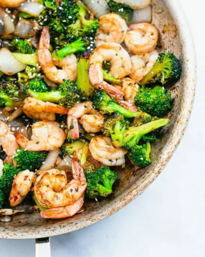 Procurando por um saudável e fácil refeição durante a semana? Experimente camarão e brócolis ! Os pares são cozidos com molho de soja e vinagre de arroz até ficarem brilhantes e saborosos. O contraste do brócolis tenro e crocante com o camarão suculento é realmente impressionante.