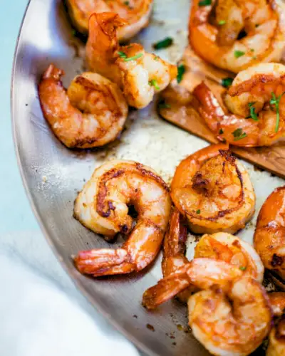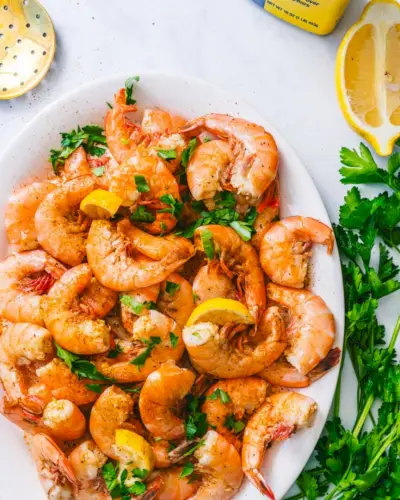 Camarão grelhado está fora deste mundo. É macio, suculento e muito rápido de cozinhar. Você nem precisa pré-aquecer o forno! É perfeitamente temperado com alho e limão.