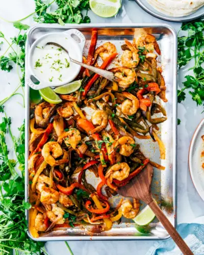Procurando uma refeição fácil e saborosa de 30 minutos que sempre faça sucesso? Experimente estas clássicas Fajitas de Camarão! Este favorito do Tex Mex é uma receita para o sucesso na hora do jantar. O vegetais fajita são temperados com perfeição e os camarões são suculentos e amanteigados.
