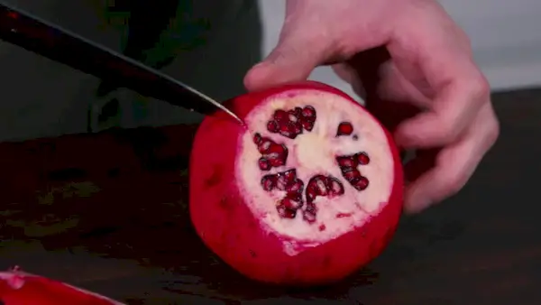 Com uma faca afiada, primeiro você cortará a parte superior da fruta. Corte apenas o suficiente para revelar algumas das sementes de dentro e você também verá as seções naturais da romã. Em seguida, simplesmente marque a parte externa da fruta ao longo dessas seções, até a base, tomando cuidado para cortar apenas um quarto de polegada de profundidade.