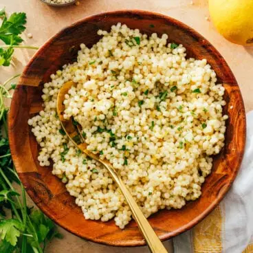 Aqui está um acompanhamento fácil que é tão saboroso quanto versátil: Cuscuz israelense, também conhecido como cuscuz pérola ! Essas bolinhas de massa têm uma textura deliciosamente mastigável e levam apenas 10 minutos para cozinhar. Misture o cuscuz com azeite e limão, e é um acompanhamento rápido que combina com quase tudo. Ou use-o em uma tigela de grãos ou misture com vegetais frescos Salada de cuscuz israelense . É sempre um sucesso em nossa casa. Veja como cozinhar!