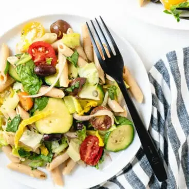 Uma receita de jantar vegano saudável durante a semana, esta salada de macarrão simples apresenta um Molho italiano e ingredientes de grande sabor: azeitonas Kalamata, alcaparras e pepperoncini. Continue lendo para ver a receita!