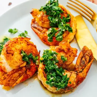 Esta receita de camarão gigante é uma ideia de jantar rápida e fácil! O molho chimichurri com ervas complementa perfeitamente os suculentos frutos do mar.