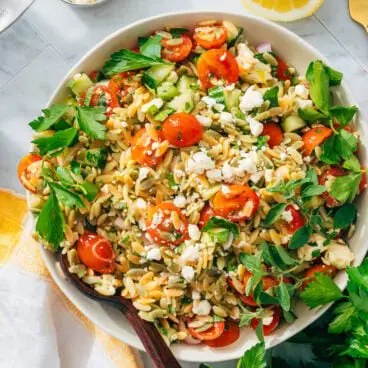 Esta receita de salada de macarrão orzo é o acompanhamento ou almoço perfeito! Repleto de sabor, é carregado com vegetais frescos e queijo feta.