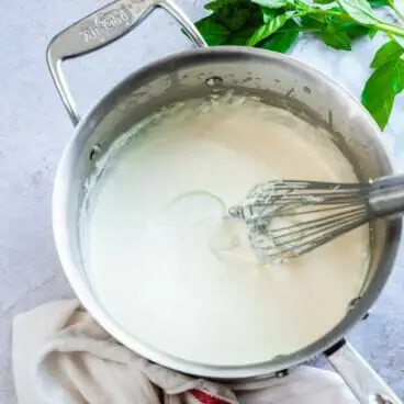 Este molho cremoso de parmesão usa apenas alguns ingredientes. E adivinhe? Não há creme nele! O creme é mais um ingrediente especial que normalmente não guardamos na geladeira. Então essa receita é feita com leite em vez de creme! Sai perfeitamente rico e cremoso sem ele. Os ingredientes do molho cremoso de parmesão são:
