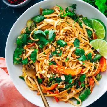 Esta receita de macarrão de amendoim é uma receita fácil de jantar que fica pronta em menos de 30 minutos (que também é uma receita jantar vegano !). Aqui estão mais algumas receitas de jantar repletas de plantas, rápidas e fáceis, que você pode gostar: