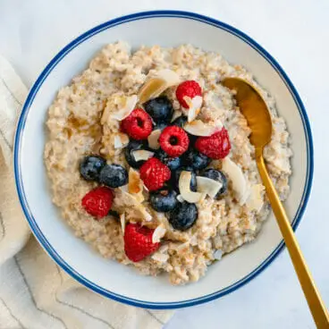 Você também pode cozinhar aveia cortada em aço em uma Panela Instantânea. Isso torna o método totalmente prático e cria uma ótima textura cremosa. Esse Aveia cortada em aço para panela de pressão faz um lote grande de 8 a 10 porções: é perfeito para se divertir ou comer durante toda a semana. Falando em…
