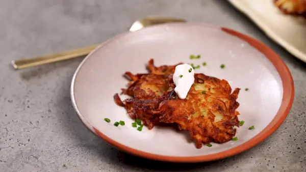 O truque para fazer uma panqueca de batata crocante e bem unida é usar batatas russet, que têm alto teor de amido. Você pode ralar as batatas em um ralador ou um processador de alimentos torna esta receita especialmente rápida e fácil. Não deixe de embrulhar as batatas raladas em uma toalha e espremer o excesso de líquido; é a chave para obter a textura certa. Se quiser, você pode fazer essas panquecas de batata cerca de uma hora antes de servi-las; segure-os em uma gradinha colocada em uma assadeira em forno a 300 ° F até que esteja pronto para comer.