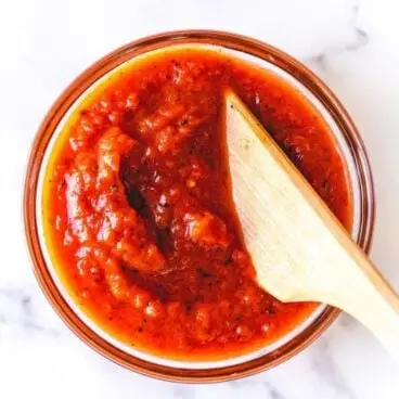 Este molho marinara caseiro fácil é cheio de sabor picante de tomate e leva pouco mais de 15 minutos para fazer: não é necessário picar! Tomates assados no fogo tornam o tempo de cozimento mais rápido do que uma marinara padrão.