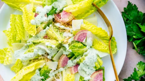 Esta salada de alface romana é simples e deslumbrante! Combina a refrescante alface com cremoso Molho Deusa Verde e pão ralado crocante.