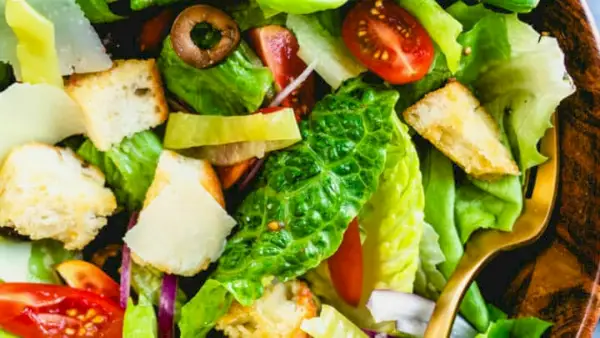 Esta clássica salada italiana é um acompanhamento deslumbrante! Inclui alface romana crocante, croutons crocantes, pepperoncini picante e um molho caseiro vigoroso.