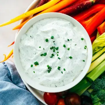 Esta receita de molho vegetariano tem o mesmo sabor que você esperaria de um prato vegetariano: só que melhor! Algo na combinação de temperos aqui o torna absolutamente irresistível: e provavelmente são temperos que você já tem em mãos. O outro truque? Combinar iogurte grego e maionese para fazer um molho cremoso, mas não muito rico. (Usamos essa ideia em nosso Molho César , molho de alcachofra de espinafre e muito mais.) Aqui está o que você precisa para este molho de vegetais: