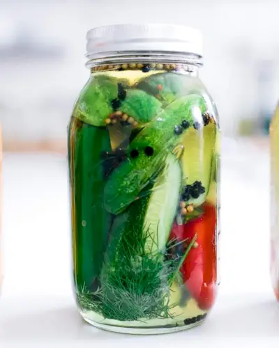 Esta receita é o lugar para começar se você é novo em conservas ou nunca fez picles. Picles de geladeira são vegetais conservados em solução de vinagre e simplesmente refrigerados por 1 hora. Eles duram 1 mês na geladeira, em vez de um ano ou mais na prateleira, como os tradicionais picles enlatados. Você não precisa de nenhum equipamento sofisticado de enlatamento ou esterilização. Não só é simples, mas você também ficará surpreso com o sabor delicioso depois de relativamente pouco esforço!