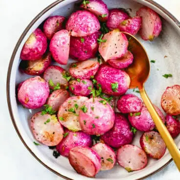 Se você já experimentou couve-flor assada ou couve de Bruxelas assada, notará que esse vegetal com sabor cru muito forte fica doce no forno. Ao experimentar estes rabanetes assados, eles terão a mesma essência suave e doce que você costuma ver ao assar esses vegetais da mesma família!