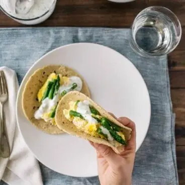 A técnica de cozinhar aspargos para esses tacos de aspargos é uma das nossas favoritas que encontramos até agora: cozinhá-los em uma assadeira! Não envolve óleo ou manteiga: basta cozinhar os espargos em uma panela seca e adicionar água para cozinhá-los no vapor enquanto cozinha. Com algumas pitadas de sal kosher , as lanças são macias e deliciosas. Outra ideia de servir o prato é pular os tacos e servir apenas ovos mexidos de ricota com aspargos e molho de iogurte de cebolinha: essa seria outra ótima opção de brunch.