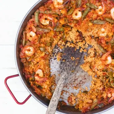 Uma panela de paella é uma panela grande, redonda e rasa, com alças, usada para cozinhar paella. Por ser tão raso, permite que o arroz cozinhe de forma consistente, em vez de ficar aguado e pegajoso, como aconteceria em uma frigideira. A melhor forma de paella para esta paella de frutos do mar é aquela que mede 16 a 18 polegadas. Não tente fazer esta receita em uma panela menor! É personalizado para esse tamanho de panela e atende 8 pessoas. Aqui está a panela grande de paella que usamos.