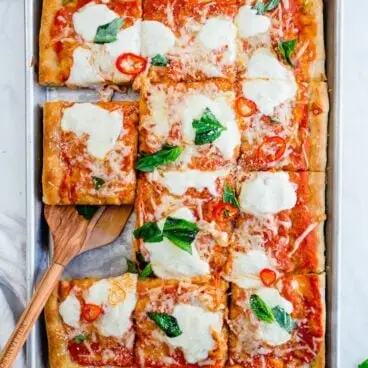 - Servir: Se for usar, em uma tigela pequena, misture a rúcula baby com o azeite e ¼ colher de chá sal kosher . Polvilhe a pizza com manjericão rasgado e adicione a rúcula por cima. Corte em pedaços com uma faca (o cortador de pizza não chega até as bordas da assadeira) e sirva imediatamente.