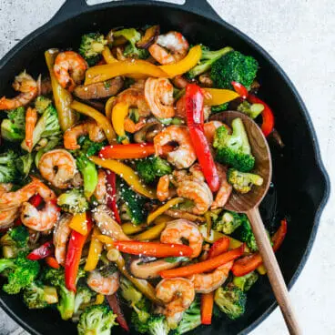 Há muito mais vegetais que você pode adicionar para personalizar este refogado de camarão. Mas lembre-se: é importante não encher demais a frigideira! Mais vegetais não é necessariamente melhor. Usar muitos faz com que eles se empilhem uns sobre os outros e cozinhem no vapor em vez de fritar, resultando em vegetais encharcados. Use sua frigideira maior e aproximadamente 6 a 8 xícaras de vegetais no total. Aqui estão algumas idéias para mais vegetais e quanto tempo eles levam para fritar: