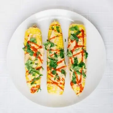 Para esta receita de espiga de milho picante, fizemos nosso Espiga de milho cozido e depois reguei com molho de tahine e molho picante Sriracha. Isso é realmente tudo que existe para fazer! Se preferir espiga de milho grelhado, acesse Milho Grelhado Perfeito .
