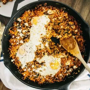 Esta frigideira de batata-doce apresenta batata-doce ralada crocante, folhas verdes, ovos e queijo feta, servido como um jantar vegetariano simples.