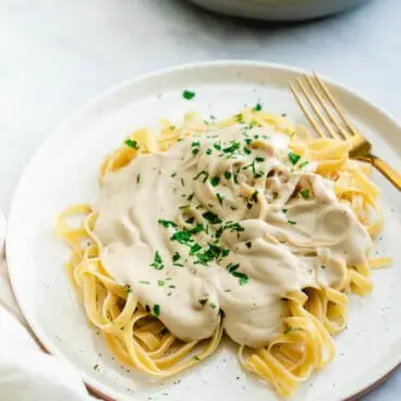 Você ficará surpreso ao ver como os cajus se misturam em um corpo rico e cremoso para este molho alfredo vegano! A menos, claro, que você já conheça esse truque: ele é amplamente utilizado em receitas veganas. Alex e eu o usamos frequentemente em nossas receitas à base de plantas aqui no Yumpulse! Aqui estão algumas de nossas receitas favoritas que também usam castanha de caju para torná-las cremosas sem o uso de laticínios: