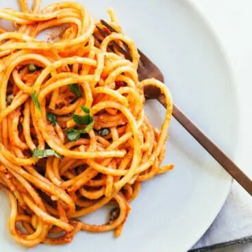 Este espaguete vegano com molho marinara cremoso tem um molho extremamente saboroso: alho, cebolinha e alcaparras trabalham juntos com creme de caju para fazer o máximo umami possível. Isso é tão.muito.bom . Depois de refazer várias vezes o que pensava ter feito naquela noite predestinada, Alex conseguiu recriar o delicioso espaguete vegano que havia feito por capricho. Como sabíamos que faríamos este aqui anos depois, desta vez fizemos questão de anotá-lo!