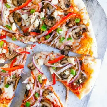 Esta pizza vegetariana suprema é extremamente deliciosa! É totalmente carregado com cogumelos salteados, pimentão verde, cebola roxa, queijo feta e orégano.
